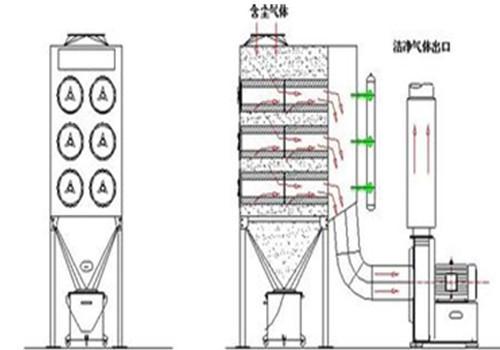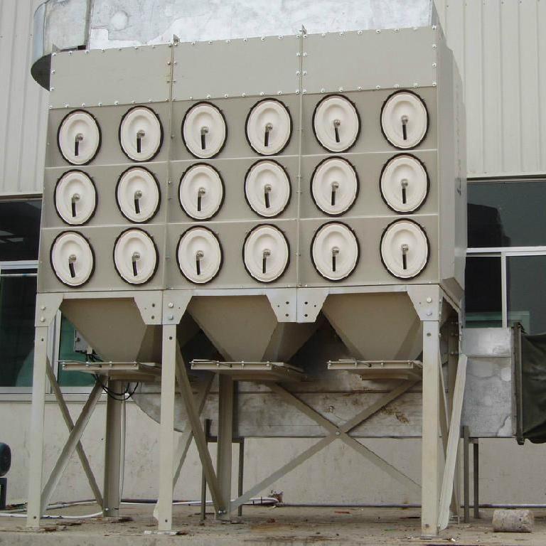 一般為負(fù)壓作業(yè),含有粉塵的氣體有進(jìn)風(fēng)口進(jìn)入濾筒除塵器內(nèi),在濾芯內(nèi)負(fù)壓的作用下,經(jīng)過濾芯過濾,進(jìn)入潔凈室從出風(fēng)口排出。當(dāng)粉塵在濾料表面上越積越多,阻力越來越大,當(dāng)達(dá)到設(shè)定值時,脈沖閥打開,壓縮空氣直接噴入濾筒中心,對濾筒進(jìn)行順序脈沖清灰,使其恢復(fù)低阻運(yùn)行。含有粉塵的氣體進(jìn)入過濾室,比較大的粉塵顆粒直接落到灰斗,含有粉塵的氣體經(jīng)過濾芯凈化,粉塵會粘附在濾芯的表面,干凈的氣體經(jīng)過濾芯口到達(dá)靜氣室,在有引風(fēng)機(jī)經(jīng)煙筒排入大氣中。當(dāng)濾芯便面的粉塵不斷的增加,導(dǎo)致除塵器內(nèi)的阻力增加,當(dāng)阻力增加到一定的數(shù)值時,控制儀會發(fā)出信號,進(jìn)行程序的控制,這時脈沖閥會逐個打開,壓縮空氣通過噴口對濾芯進(jìn)行噴吹清灰,在壓縮空氣的噴吹下,附在濾芯上的粉塵層快速的脫離濾芯落入灰斗中,在由螺旋輸送機(jī)或卸灰閥直接排出。