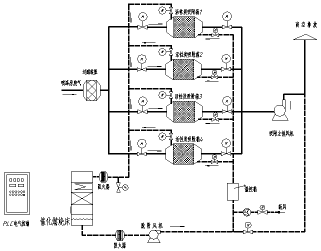 2. 系統(tǒng)由4個(gè)活性炭吸附箱(3用1備),1個(gè)催化燃燒床構(gòu)成,將各條生產(chǎn)線中的所有排氣管合并連接引至凈化設(shè)備,各個(gè)支管上安裝一只手動(dòng)調(diào)節(jié)閥,配比例調(diào)節(jié);廢氣經(jīng)收集匯總后送入集氣箱,再將廢氣送入干式過(guò)濾器,干式過(guò)濾器能更為精細(xì)的祛除廢氣中的粉塵和漆霧,從而避免活性炭微孔被堵塞,延長(zhǎng)活性炭的使用周期,活性炭吸附器接近飽和時(shí),系統(tǒng)將自動(dòng)切換到備用活性炭吸附箱(此時(shí)飽和活性炭吸附箱停止吸附操作),然后用熱氣流對(duì)飽和活性炭吸附箱進(jìn)行解吸脫附,將有機(jī)物從活性炭上脫附下來(lái)。在脫附過(guò)程中,有機(jī)廢氣已被濃縮,濃度后的濃度較原濃度提高幾十倍,達(dá)2000mg/m3以上,濃縮廢氣送到催化燃燒裝置,最后被分解成CO2與H2O排出。完成解吸脫附后,活性炭吸附器進(jìn)入待用狀態(tài),待其他活性炭吸附箱接近飽和時(shí),系統(tǒng)再自動(dòng)切換回來(lái),同時(shí)對(duì)飽和活性炭吸附器進(jìn)行解吸脫附,如此循環(huán)工作。最后凈化后的潔凈氣體由主排風(fēng)機(jī)排入大氣中。