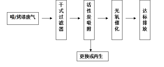 根據(jù)我公司大量處理該類廢氣的經(jīng)驗,最有效的方法是吸附法與光氧催化的綜合治理,根據(jù)維修企業(yè)的實際情況,綜合考慮各因素,采取以下治理工藝: