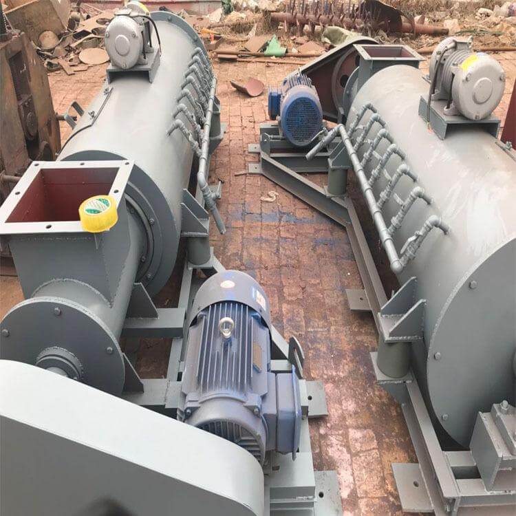 除塵器處理回收的粉塵經(jīng)過(guò)下料卸灰閥進(jìn)入CSZ系列加濕器的入料斗內(nèi),由卸灰旋轉(zhuǎn)葉輪將灰塵送入機(jī)體內(nèi)的螺旋輸送槳葉上,經(jīng)葉輪推入加濕主筒,在攪攔機(jī)均勻的拌料下,水噴淋均勻注入料內(nèi),在勻速攪拌的作用下,使粉塵加濕,加濕后的粉塵在多柱螺旋線性的推力作用下,從出料口緩緩送出,卸入機(jī)體外的粉塵運(yùn)送裝置.在螺旋葉輪體的勻速運(yùn)轉(zhuǎn)時(shí),調(diào)幅振動(dòng)裝置間歇性的工作,使拌料筒周壁等幅振蕩,將加濕后的粘性粉塵體與金屬筒壁脫離,完全送如卸料口排出.